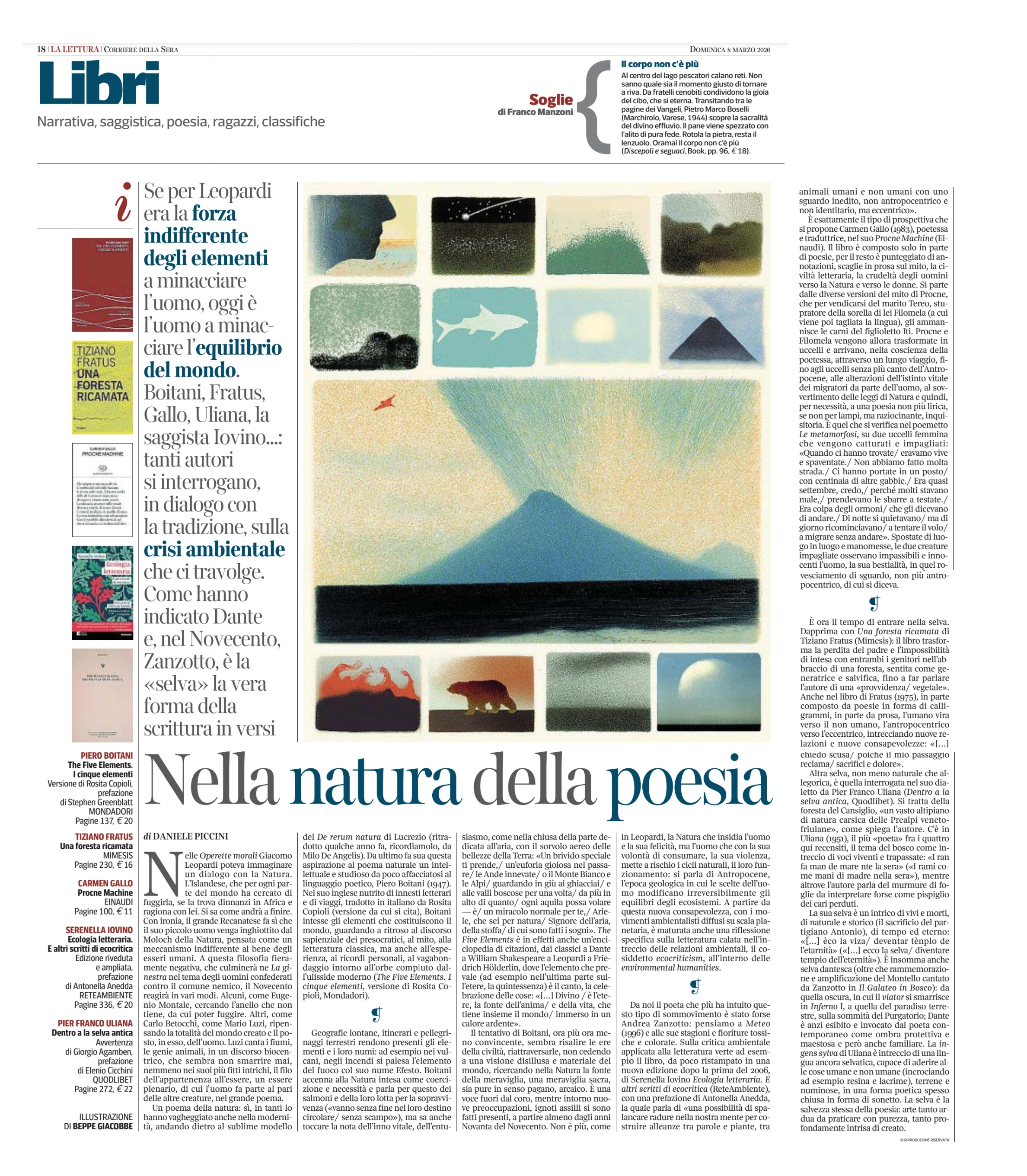 «Se per Leopardi era la forza indifferente degli elementi a minacciare l’uomo, oggi è l’uomo a minacciare l’equilibrio del mondo. Boitani, Fratus, Gallo, Uliana, la saggista Iovino…: tanti autori si interrogano, in dialogo con la tradizione, sulla crisi […] Una foresta ricamata di Tiziano Fratus (Mimesis): il libro trasforma la perdita del padre e l’impossibilità d’intesa con entrambi i genitori nell’abbraccio di una foresta, sentita come generatrice e salvifica, fino a far parlare l’autore di una “provvidenza vegetale”» (Daniele Piccini, La Lettura)