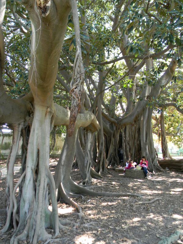Uno degli alberi esotici che qui ha trovato ambiente favorevole è il Ficus macrophylla, di cui mi sono occupato spesso nelle mie pubblicazioni e nei miei spostamenti radicali. Fra tutte le città che ne ospita Palermo è quella dove si trovano gli esemplari più grandi, i più annosi e nella maggiore concentrazione. Si contano almeno cinquanta alberi di dimensione monumentale, anche se insuperabili sono il patriarca dell’orto botanico, una sorta di Sagrada Familia degli alberi messo a dimora da Tineo nel 1845, ed il maggiore dei ficus d’Europa nei giardini di Villa Garibaldi, a Piazza Marina.