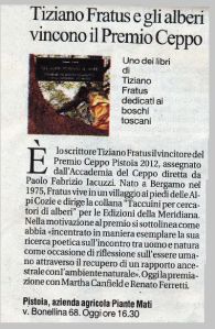 S’è svolta in un calorosa quanto affollata sala conferenze dell’Azienda Agricola Piante Mati di Pistoia la premiazione del Premio speciale Ceppo Natura 2012. Paolo Fabrizio Iacuzzi (direttore del Premio) e i fratelli Mati hanno consegnato il riconoscimento all’autore del ciclo di opere Homo Radix, Tiziano Fratus.