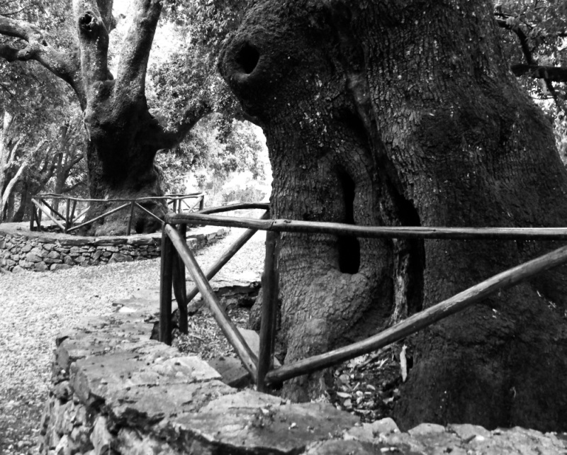 Due sono a pochi metri di distanza, protetti da una staccionata circolare, all’interno di due catini in pietra. Il primo a due metri si biforca e sale fino ai dieci metri. Il secondo si apre prima dei due metri di altezza in tre branche di grossa dimensione che poi ramificano, una più piccola e corta che ricurva a terra. Il primo leccio presenta alcune cavità alla base. Vado a misurarne la circonferenza dei tronchi a petto d’uomo: 630 e 544 cm. Si dice che questi giganti abbiano, circa, seicento anni. Nella stessa area è presente, ad alcune decine di metri di distanza, un terzo leccio protetto da muretto e steccato, più alto, che fra i due metri ed i due metri e mezzo emette diverse branche, mentre il tronco prosegue la corsa al cielo. Alto quindici metri. Il tronco è decisamente più contenuto rispetto ai precedenti. Con l’auto percorro la strada sterrata che si disperde nel cuore della lecceta, un bosco che canta nel silenzio, abitato da centinaia e centinaia di plurisecolari.