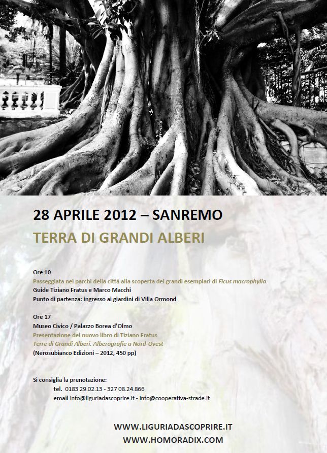 Ore 10 – Visita nei parchi storici e pubblici della città di Sanremo lungo l’Itinerario dei ficus della Baia di Moreton (Ficus macrophylla) guidati dai cercatori di alberi e guide Tiziano Fratus e Marco Macchi, in collaborazione con Cooperativa Strade – Liguria da scoprire.