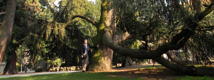 Nella fotografia Fratus è appoggiato al più grande cedro dell’Atlante presente nel parco, con due sorprendenti branche che si allungano alla base del tronco strisciando a terra.