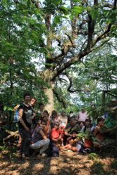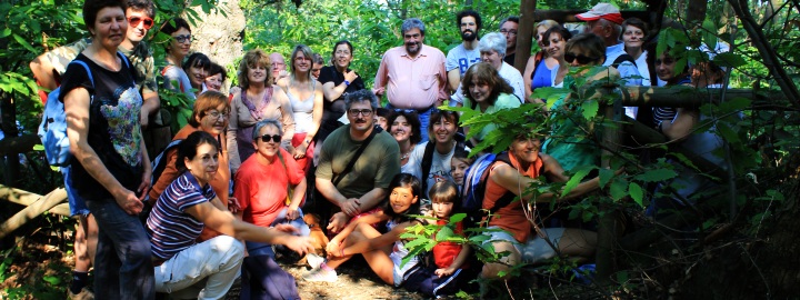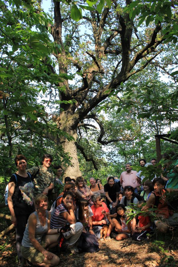 E’ stato un vero e grande piacere vivere questa giornata con oltre cinquanta entusiasti camminatori, agguerriti e appassionati, amanti della natura e dei boschi e dei paesaggi della collina torinese che dalla parrocchiale di San Rocco sono ascesi per oltre due ore lungo i sentieri e nei boschi misti di roveri, cerri, querce rosse, pini e robinie, castagni e noccioli, fino alla cima del Bric Tourniol al cospetto della splendida cerrosughera, Quercus crenata, che vi riposa, con i suoi tre secoli di vita sulle radici. Purtroppo l’albero manifesta i segni di una malattia fungina che ne sta intaccando le ramificazioni, ma non sembra un attacco grave. Abbiamo misurato la circonferenza del tronco: 360 cm a petto d’uomo, una misurazione superiore ai tre metri che avevo misurato pochi anni orsono. A seguire ricco e lauto buffet / aperitivo nello splendido giardino della residenza di Paolo e Sandra Sassone, dominato da due esemplari straordinari di Ficus carica, con presentazione di Terre di Grandi Alberi. Un ringraziamento speciale a tutti i membri dell’associazione Attorno alla Ro Verda e a Letizia Ferri.