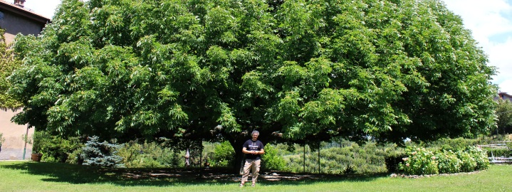 Un sentiero conduce al centro dell’albero, tre rami sono sostenuti da stampelle metalliche, ma è soltanto qui sotto che si può apprezzare un incredibile lavoro di tiranti che è stato fatto, ad occhio, almeno una ventina di anni fa, e che regola l’intera ramificazione centrale dell’albero. Un capolavoro, nel genere. In questo modo l’albero ha mantenuto la stabilità, ed ora presenta queste branche allungate e distese. Il tronco misura 425 cm di circonferenza a petto d’uomo, ridotto rispetto al più grande d’Italia che se ne sta in Valle d’Aosta, quest’ultimo all’ultimo stadio però della sua esistenza. Qua siamo in piena salute, la chioma è densissima, dieci branche primarie che s’irradino a 360 gradi.