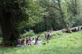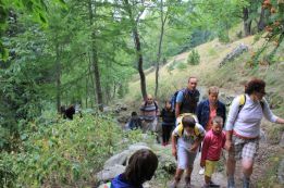 Scatti dalle passeggiate e dai laboratori per bambini e famiglie nei boschi della Val Varaita: il bosco dell’Allevé con larici e pini cembri (sopra), il castagno monumentale di borgata Fini Prato / Pratolungo a Melle (sotto).
