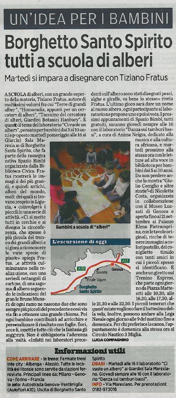 E’ uscito ieri sulle colonne del Secolo XIX di Genova questo bell’articolo dedicato al laboratorio Ci vuole un albero! che replica a Borghetto Santo Spirito domani martedì 21 agosto 2012.