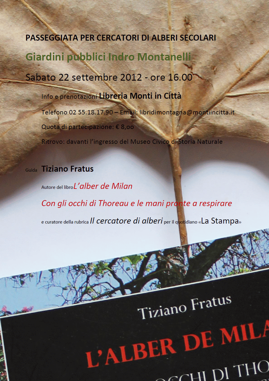 Una vera e propria passeggiata per cercatori di alberi secolari (duranta: 2 ore) sarà poi condotta da Tiziano Fratus la domenica successiva ai Giardini pubblici Indro Montanelli, con inizio alle ore 16 e ritrovo davanti all’ingresso del Museo di Scienze Naturali. Un evento in collaborazione con la libreria Monti in Città.