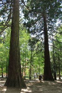 Pavullo nel Frignano – Un cercatore di alberi fra due delle sequoie del Parco dei Pini
