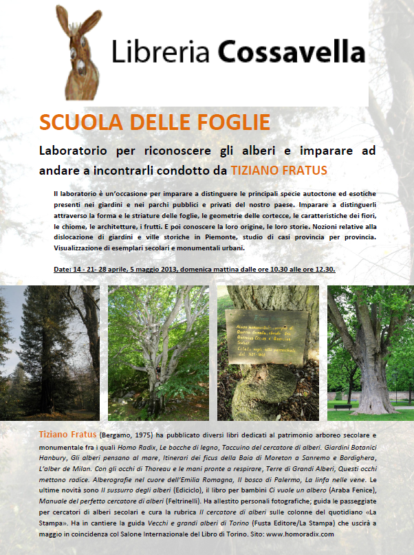 Il laboratorio è un’occasione per imparare a distinguere le principali specie autoctone ed esotiche presenti nei giardini e nei parchi pubblici e privati del nostro paese. Imparare a distinguerli attraverso la forma e le striature delle foglie, le geometrie delle cortecce, le caratteristiche dei fiori, le chiome, le architetture, i frutti. E poi conoscere la loro origine, le loro storie. Nozioni relative alla dislocazione di giardini e ville storiche in Piemonte, studio di casi provincia per provincia. Visualizzazione di esemplari secolari e monumentali urbani.