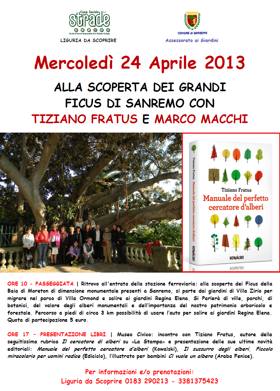 ORE 10 – Passeggiata | Ritrovo all’entrata della stazione ferroviaria: alla scoperta dei Ficus della Baia di Moreton di dimensione monumentale presenti a Sanremo, si parte dai giardini di Villa Zirio per migrare nel parco di Villa Ormond e salire ai giardini Regina Elena. Si Parlerà di ville, parchi, di botanici, del valore degli alberi monumentali e dell’importanza del nostro patrimonio arboricolo e forestale. Percorso a piedi di circa 3 km possibilità di usare l’auto per salire ai giardini Regina Elena. Quota di partecipazione 5 euro.