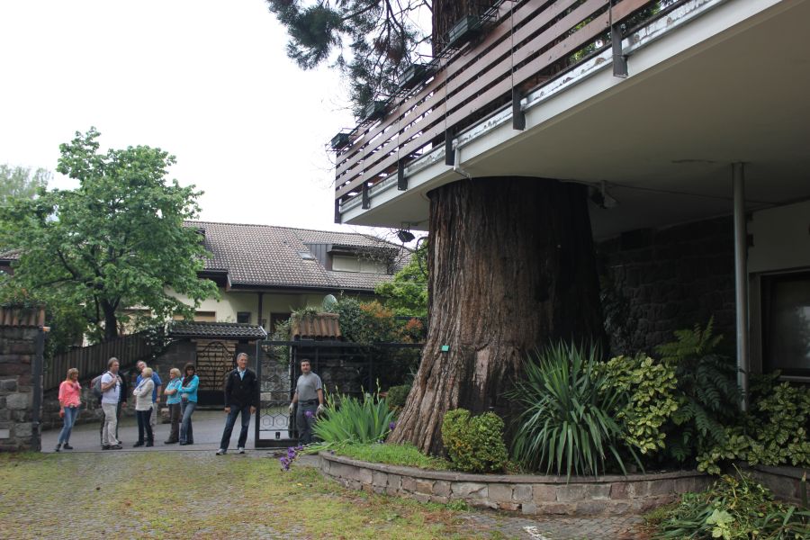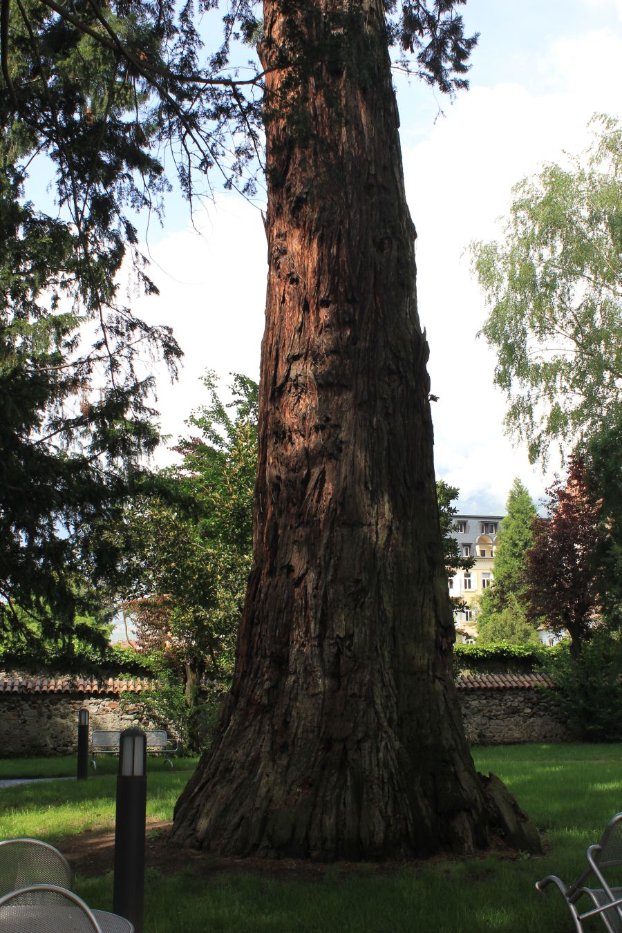 Una quantità di sequoie di grande stazza abbelliscono Merano. Alcune a nord, nella zona più signorile, fra castelli, ville private che danno sull’itinerario della Sissi Weg, la strada che percorreva la celebre principessa Sissi, compresa la seconda sequoia più grande della regione, che ho potuto documentare poche settimane prima del suo già deciso abbattimento: si trova proprio sulla Sissi Weg ed è nel giardino della Villa Mathilda, ora in fase di restauro. La notizia di questo abbattimento ha scatenato una protesta numerosa e veemente ma i dati sulla salute dell’albero sono ahimè indiscutibili: l’unico modo per non abbatterlo sarebbe chiudere l’intera area. Ne ho misurato la circonferenza, 835 cm a petto d’uomo, che si avvicina al record della sequoia del Maso Laitachof a Salorno. La cima è però sfrondata, una profonda carie sta lavorando all’interno e ne ha oramai compromesso la stabilità. Due sequoie si trovano al Park Hotel dei Vigile del Fuoco, la maggiore è ora catturata dall’abbraccio in cemento di una terrazza costruita nel 1960. L’idea era quella di far transitare l’albero nella struttura esterna dell’edificio, ma questo mezzo secolo che ci separa ha ingrossato l’albero che adesso poggia contro il cemento e si rischia il danno reciproco. Bisognerà intervenire per liberarla, finché si è in tempo. Il suo tronco misura 750 cm a petto d’uomo.