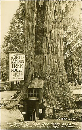 Tessendo le tappe del futuro viaggio in California mi sono imbattuto in alcune foto dedicate ad un misterioso World Famous Treehouse Redwood, una casa su sequoia, sulla pagina Facebook della S.I.A. (Società Italiana di Arboricoltura). Quattro foto che mostrano una sequoia matura mentre un tecnico esegue alcune operazioni di verifica e rimonda, alla base le insegne di un negozio che vi sarebbe stato costruito all’interno. Facendo una ricerca in internet esce in prima battuta un ristorante costruito intorno ad una sequoia a 45 minuti da Auckland, The Redwood Treehouse (www.yellowtreehouse.co.nz), dove possono pranzare una trentina di persone. Ricordo di averne vista una qui in Europa, fra le pagine del volume Exceptional Treehouses, pubblicato nel 2009 a Parigi e a New York: una casa progettata intorno ad una sequoia costale in una proprietà privata in Borgogna. Ma di questa Famous californiana non avevo mai sentito parlare. Sono andato anche a sfogliare gli indici dei diversi libri dedicati ai grandi alberi che ho in casa ma non ne ho trovato traccia. Le prime foto che trovo in internet sono tutte d’epoca, in bianco e nero, tratte da pubblicazioni rigorosamente fuori commercio, dai tempi in cui nemmeno i miei genitori erano al mondo; una foto colorata a mano ritrae una donna all’interno di un negozio, capisco che si tratta della signora Minnie Stoddard Lilley (1875-1947). Un nome nel quale non ero mai inciampato. Oggi l’albero esiste ancora e si trova in un parco che ne porta il nome, Lilley Redwood Park. Minnie svolse la professione di insegnante per quarant’anni, dopo il matrimonio si stabilì nella contea di Mendocino, e per insegnare doveva fare una passeggiata di cinque miglia ogni giorno, lungo il corso del fiume Eel; così, un giorno, chiese ad un boscaiolo di costruirle una piccola casetta, una “cabin” come le chiamano gli americani (come non ricordare quella celebre di Thoreau, intorno al lago di Walden). Angosce e tenebre la prima notte passata lì dentro: il tempo era scandito «da preghiere sulle labbra e una pistola fra le mani».