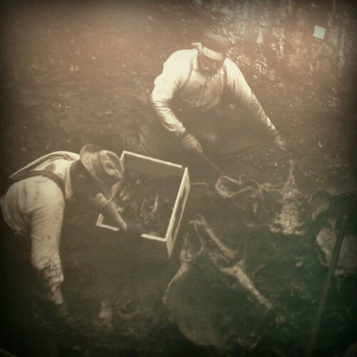 Una grossa foto ingigantita a parete mostra ricercatori baffuti al lavoro per cavar fuori dai giacimenti ossa di bacini e teschi, non riesco nemmeno a immaginare la fatica di farlo avvolti in quell’orribile tanfo di petrolio che emana il catrame, loro ci abitavamo dentro per mesi e mesi e di certo non bastava una strigliata con la spazzola per toglirlselo di dosso. Sacrifici che si fanno per la scienza!
