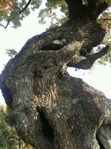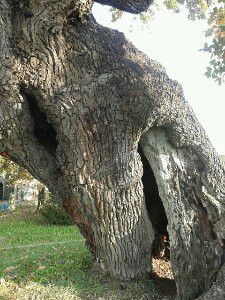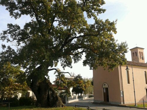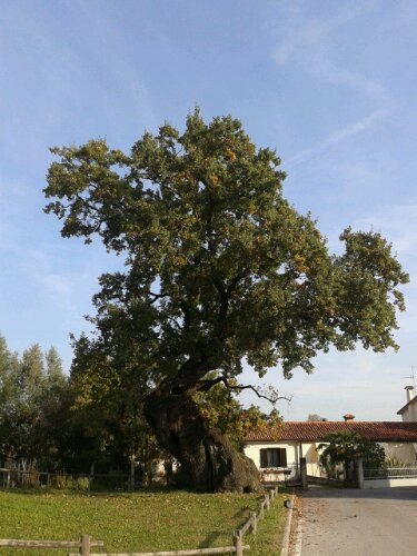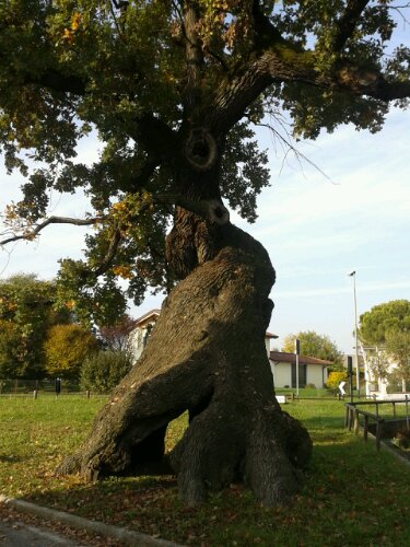 Cosa sia successo all’immensa farnia (Quercus robur) che si e’ avvitata su se stessa davanti alla piccola chiesa dedicata a Sant’Antonio, in quel di Fossalta di Portogruaro (VE) resta un mistero. L’albero presenta una ampia e profonda cavita’ interna visibile alla base e lungo la parte inferiore. Un tempo qui dentro ha vissuto una famiglia che accendeva il fuoco e cucinava e si riscaldava…