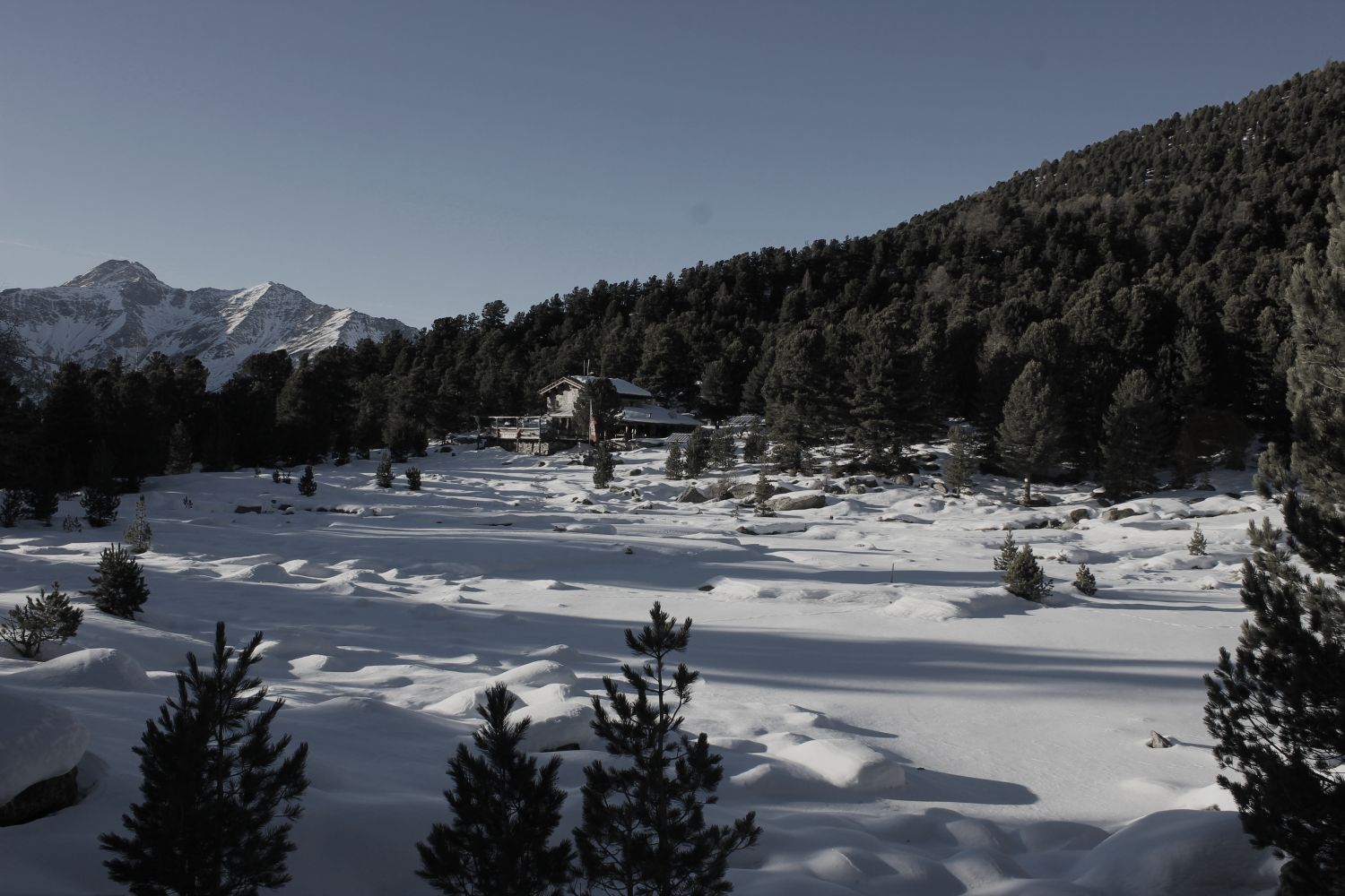 Qui d’estate gorgogliano le sorgenti che vanno a comporre lo specchio d’acqua del lago Bagnour, a 2017 metri s.l.m.. Le ultime nevicate hanno congelato il paesaggio. Solitario il rifugio che ne ha acquistato il nome.