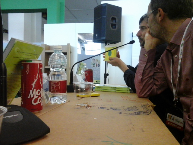 Stand Laterza: uno scatto di Lia Di Trapani (editor) a Tiziano Fratus durante i colloqui per la prossima uscita del libro L’Italia è un bosco. La prima presentazione si svolgerà al Circolo dei lettori di Torino sabato 31 maggio, nel programma del Festival Cinemambiente.