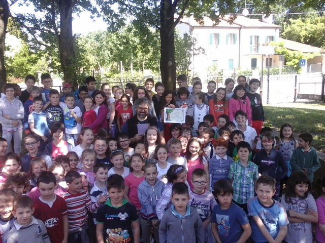 Il giorno dopo Tiziano Fratus ha presentato alle cinque classi elementari della scuola Massimo D’Azeglio i personaggi della famiglia radice, tratti dal libro Ci vuole un albero (Araba Fenice editore) e ha accompagnato i bambini alla scoperta delle curiosità botaniche del giardino alberato che circonda l’edificio scolastico. Alla fine grande festa e consegna alle insegnanti dell’attestato di Scuola Radice (Schola Radix) con omaggi e canzoni a tema. Un ringraziamento speciale a Paola Gnesin.