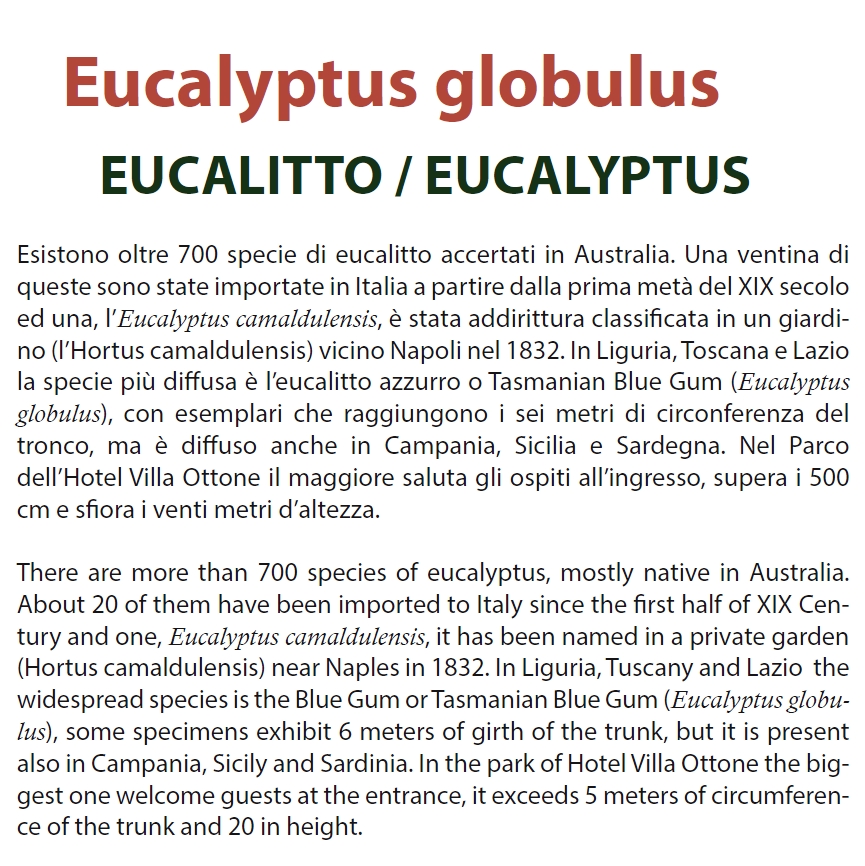 Il sentiero prevede quindici tavole con spiegazioni botaniche e notizie storiche relative alle specie autoctone ed esotiche presenti nel parco. I testi sono in italiano ed in inglese.
