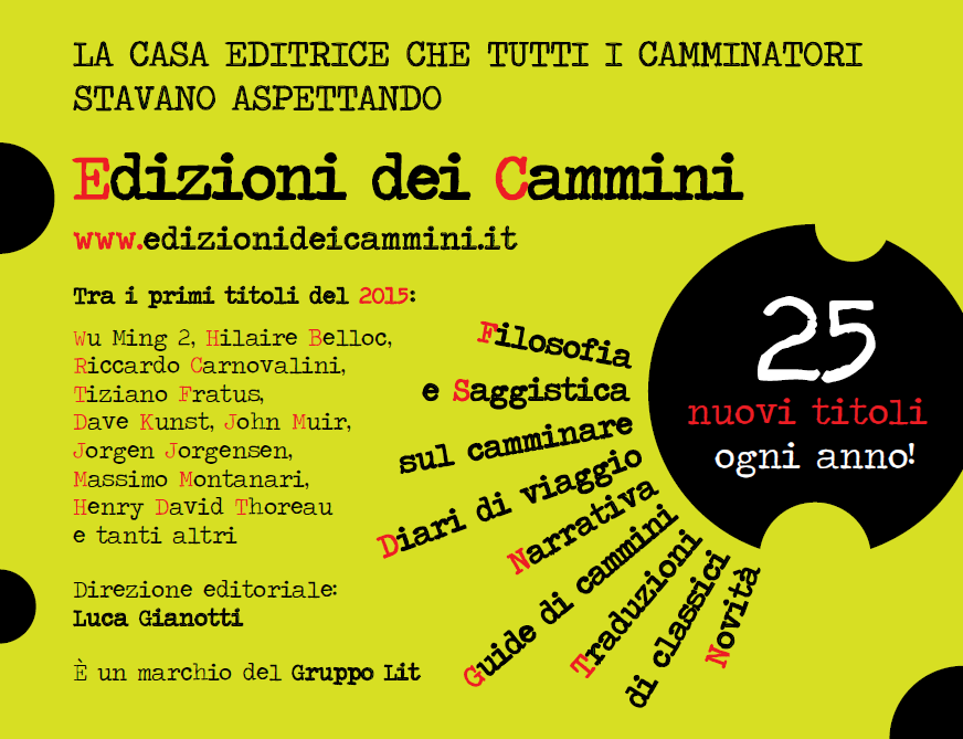 Il gruppo editoriale LIT annuncia la nascita d’un nuovo marchio editoriale legato al viaggio a piedi: saggi, diari di migrazione, guide, romanzi, pamplet scritti da viaggiatori italiani e internazionali di oggi e di ieri. La direzione editoriale è affidata a Luca Gianotti, già anima della Compagnia dei Cammini. I primi titoli usciranno in primavera. Per l’autunno è previsto un volume a firma Tiziano Fratus dedicato agli alberi della città dell’Expo: Milano.