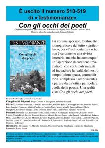 Ogni tanto accede che le traiettorie si incrocino. Talvolta accade nel tempo, talvolta accade nello spazio. Talvolta accede su carta, come in questo caso, per il doppio numero di una rivista che opera nel pensiero da sessanta (60) anni, un’era geoeditoriale. E così, °Testimonianze°, fucina fondata da Ernesto Balducci e oggi rinnovata da Severino Saccardi, ospita tanti sguardi di poeti e autori, suddivisa in tre sezioni: Ritratti (fra i diversi Milosz, Fortini, Campana, De André, Penna, Caproni, Valeri, Betocchi, Leopardi), Percorsi (Sica, Stella, Rondoni, Donati, Lecomte) e Ricordi (Bettarini su Maleti, Fo su Capello e altri).