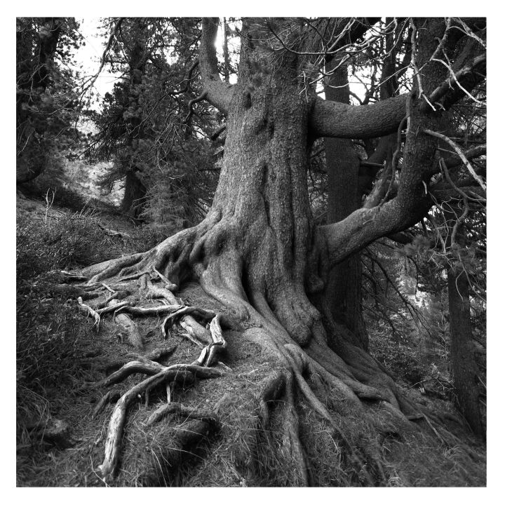 Se il Lagorai è il Tibet della Dolomiti, il Re Leone è il suo Dalai Lama. Quel che impressiona è la vastità delle radici emerse e il groviglio di rigonfiamenti che si sono sollevati dal tronco. Un piede monumentale e un labirinto radicale che pare alimentare diversi alberi. Per fotografarlo e farmene un’idea lo devo studiare da diversi punti di vista. Ogni sguardo mi consegna un albero unico e distinto. Ramificazioni a gomito, fuga verticale, ecco l’architettura d’una delle maggiori conifere autoctone dell’arco alpino.