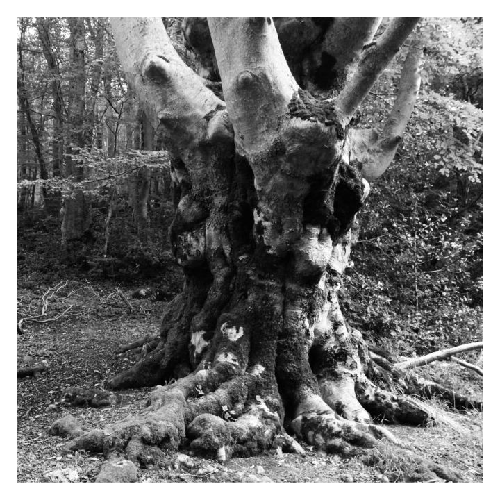 Una selva monumentale è il Bosco di Sant’Antonio. Per visitarlo bisogna allungarsi in Majella, nel comune di Pescocostanzo, provincia dell’Aquila […] I grandi faggi si trovano lungo una piana circolare che anticipa l’inizio della salita all’eremo. Incontro una fonte con testa di Gorgone scolpita nell’acciaio lavorato a Terni, emblema della classe operaia, e quel che resta di un faggio sradicato e sezionato in parti. Ecco il primo gigante che germina buio nel ventre, lungo una spaccatura verticale. Proseguendo alle sue spalle il paesaggio si restringe e alla falde della salita svettano due grandi esemplari: alla sinistra una fiamma scura, parte del tronco tappezzato di muschi, la cima si apre in una corona composta di ramificazioni danzanti […] Alla base grosse code radicali che ricordano la vitalità d’un rettile.