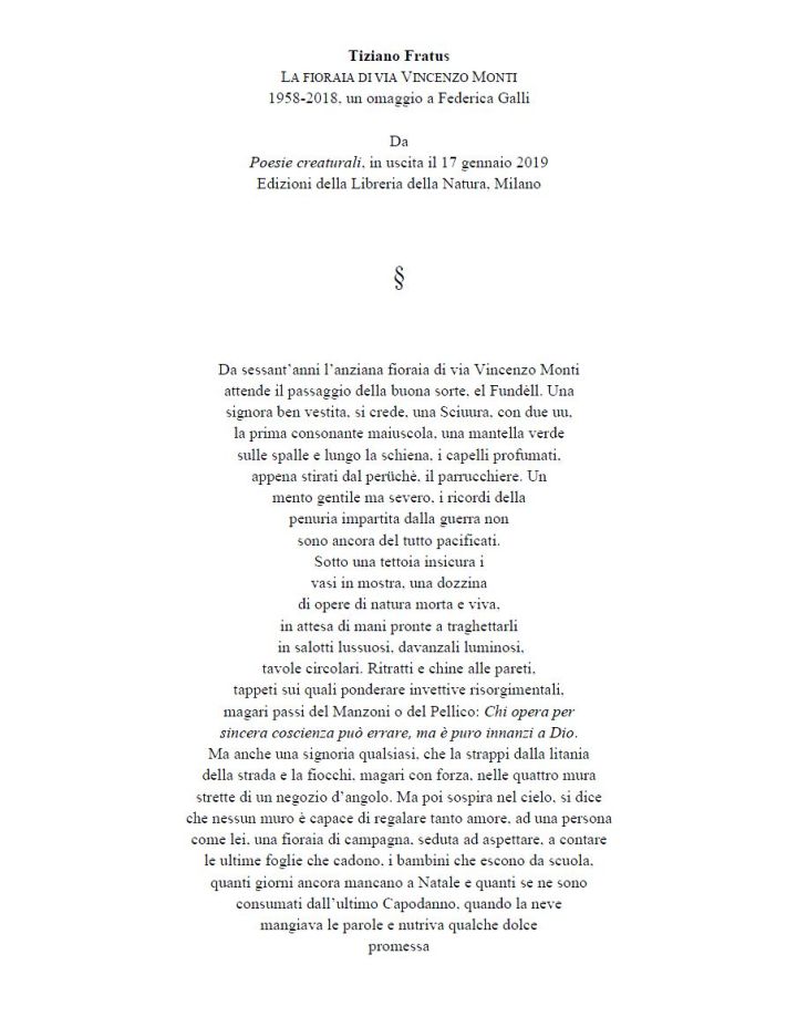 60 anni fa “l’incisora” Federica Galli – così la chiamava il Gianni, Giovanni Testori – realizzava un’opera dal titolo La fioraia di via Vincenzo Monti. Nei giorni scorsi ho scritto un articolo dedicato alla Galli e sfogliando il catalogo generale delle sue opere, pubblicato da Allemandi, a pagina 25, mi sono imbattuto in questa sua opera, che invero non ricordavo. Eppure l’immaginazione e la penna hanno iniziato a lavorare e ne è uscita una lirica che ho inserito nelle Poesie creaturali. Anzi, è la poesia che aprirà il futuro libro che sarà pubblicato e presentato a Milano, fra poche settimane – ne darò puntuale segnalazione. Questa è la poesia, vi consiglio di salvare il file sul vostro pc o tablet e di allargarlo, per leggerlo al meglio. Oppure ne potete ascoltare una lettura andando al sito Studiohomoradix.com: in home page, in basso, troverete la barra sonora, a destra il menu con la selezione delle tracce da ascoltare. La prima traccia è la poesia La fioraia di via Vincenzo Monti. Buona lettura, buon ascolto.