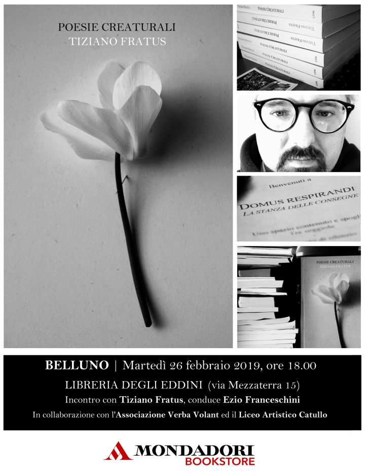 Tiziano Fratus inizia una piccola tournée di incontri in giro per l’Italia. Martedì 26 febbraio si ritorna a Belluno, per un doppio incontro: la mattina intervento al Liceo Artistico Catullo nell’ambito del Progetto Legno, la sera alle ore 18 alla Libreria degli Eddini / Mondadori Bookstore per presentare e condividere °Poesie creaturali°, in collaborazione con l’Associazione Verba Volant. Vi aspettiamo!