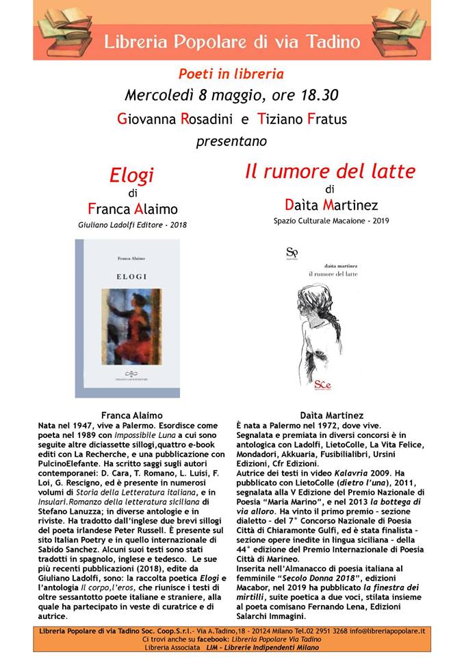 Stasera, mercoledì 8 maggio alle ore 18.30, presso la Libreria Popolare, incontro con le poetesse siciliane Franca Alaimo e Daìta Martinez, presentazione delle loro ultime opere, Elogi (Giuliano Ladolfi editore) e Il rumore del latte (SCE Spazio Cultura edizioni).