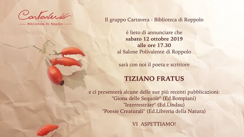 Sabato 12 ottobre 2019, alle ore 17.30, incontro presso la Sala polivalente di Roppolo (BI) con Tiziano Fratus, presentazione delle opere Giona delle sequoie (Bompiani), Poesie creaturali (Libreria della Natura) e Interrestràre (Lindau). Modera la poetessa e traduttrice Edy Quaggio. Un incontro organizzato dal gruppo Cartavera della Biblioteca civica di Roppolo.