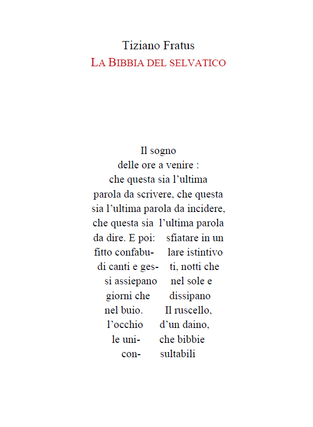 Cinque componimenti della produzione poetica di Tiziano Fratus sono state scelte per imbastire un minimo autoritratto in versi: Autoritratto di paesaggio con gelso, L’ultima foresta, Bosco itinerante, Invernare e La Bibbia del selvatico. Buona lettura.