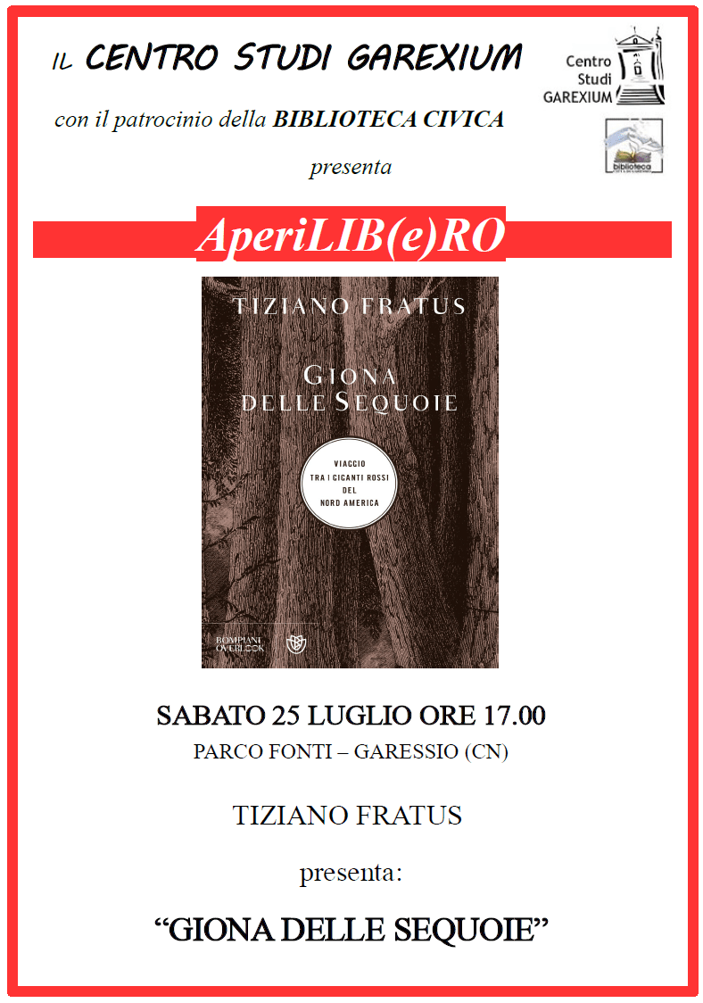 Nuovo appuntamento con Giona delle sequoie (Bompiani). Sabato 25 luglio saremo al Parco Fonti di Garessio (CN), ospiti del Centro Studi Garexium che ringraziamo. Ore 17. Vi attendiamo.