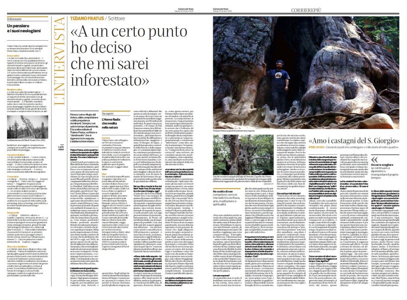 Si ringrazia il giornalista e scrittore Carlo Silini e la redazione del quotidiano Corriere del Ticino per aver pubblicato oggi, sabato 17 ottobre, una articolata intervista con Tiziano Fratus. Titolo: Ad un certo punto ho deciso che mi sarei inforestato. La doppia pagina si arricchiesce di una selezione delle voci del Dizionario per homo radix e dendrosofi. Buona lettura.