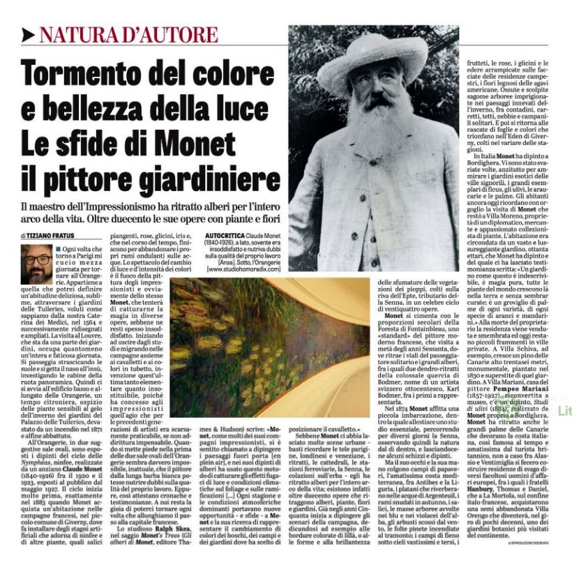 Torna la rubrica Natura d’autore firmata da Tiziano Fratus sulle pagine del quotidiano La Verità. Oggi, domenica 13 dicembre, un articolo dedicato alla natura, agli alberi e ai fiori ritratti per una vita da Claude Monet: Tormento del colore e bellezza della luce. Le sfide di Monet il pittore giardiniere. Buona lettura.