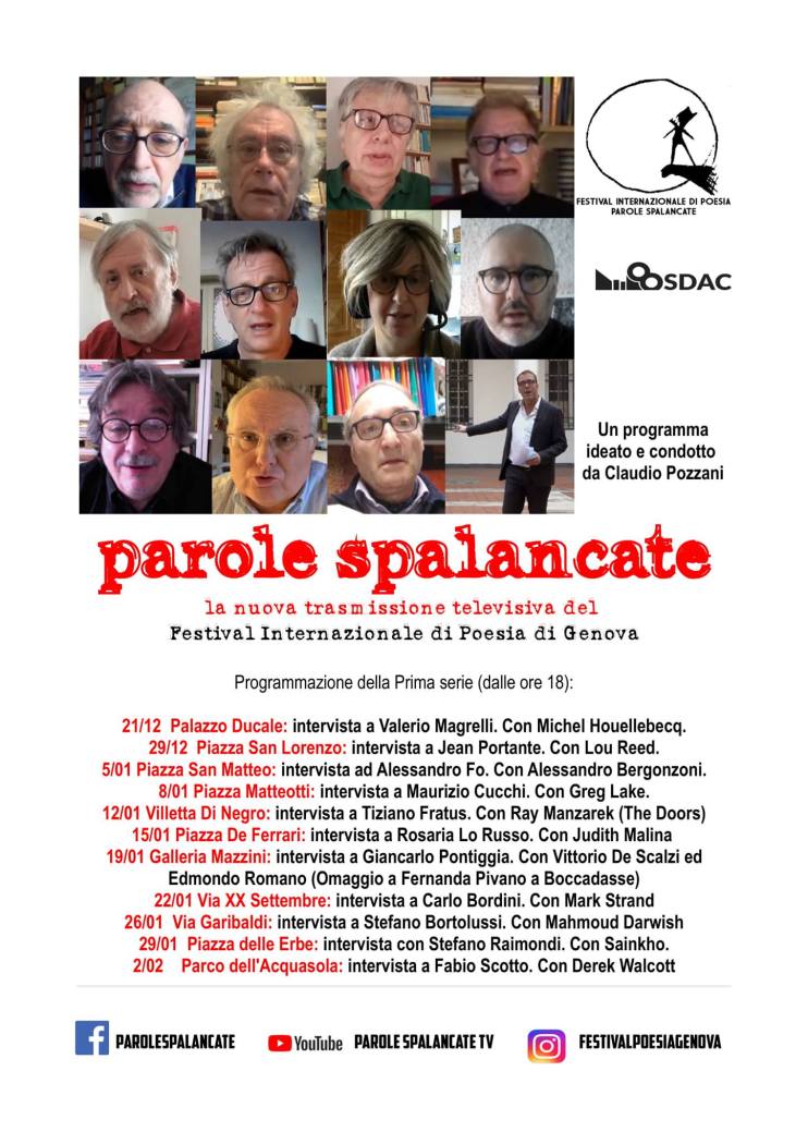 Da ventisei anni il Festival Internazionale di Poesia promuove la poesia contemporanea. Il festival trasmetterà le prime puntate di un documentario che abbraccia l’opera di alcuni poeti italiani, intervistati in luoghi-chiave di Genova, impreziosendo ogni puntata con una storica esibizione al Festival di un grande personaggio della cultura e dell’arte mondiale. Lunedì 21 dicembre (ore 18) parte la prima serie di PAROLE SPALANCATE che vi terrà compagnia fino a febbraio con Valerio Magrelli, Jean Portante, Alessandro Fo, Maurizio Cucchi, Tiziano Fratus, Rosaria Lo Russo, Giancarlo Pontiggia, Carlo Bordini, Stefano Raimondi, Fabio Scotto e performance storiche al nostro Festival di Houellebecq, Lou Reed, Bergonzoni, Greg Lake, Ray Manzarek (The Doors), Judith Malina (Living Theatre), Vittorio De Scalzi ed Edmondo Romano (per Fernanda Pivano), Mark Strand, Mahmoud Darwish, Sainkho, il premio Nobel Walcott.