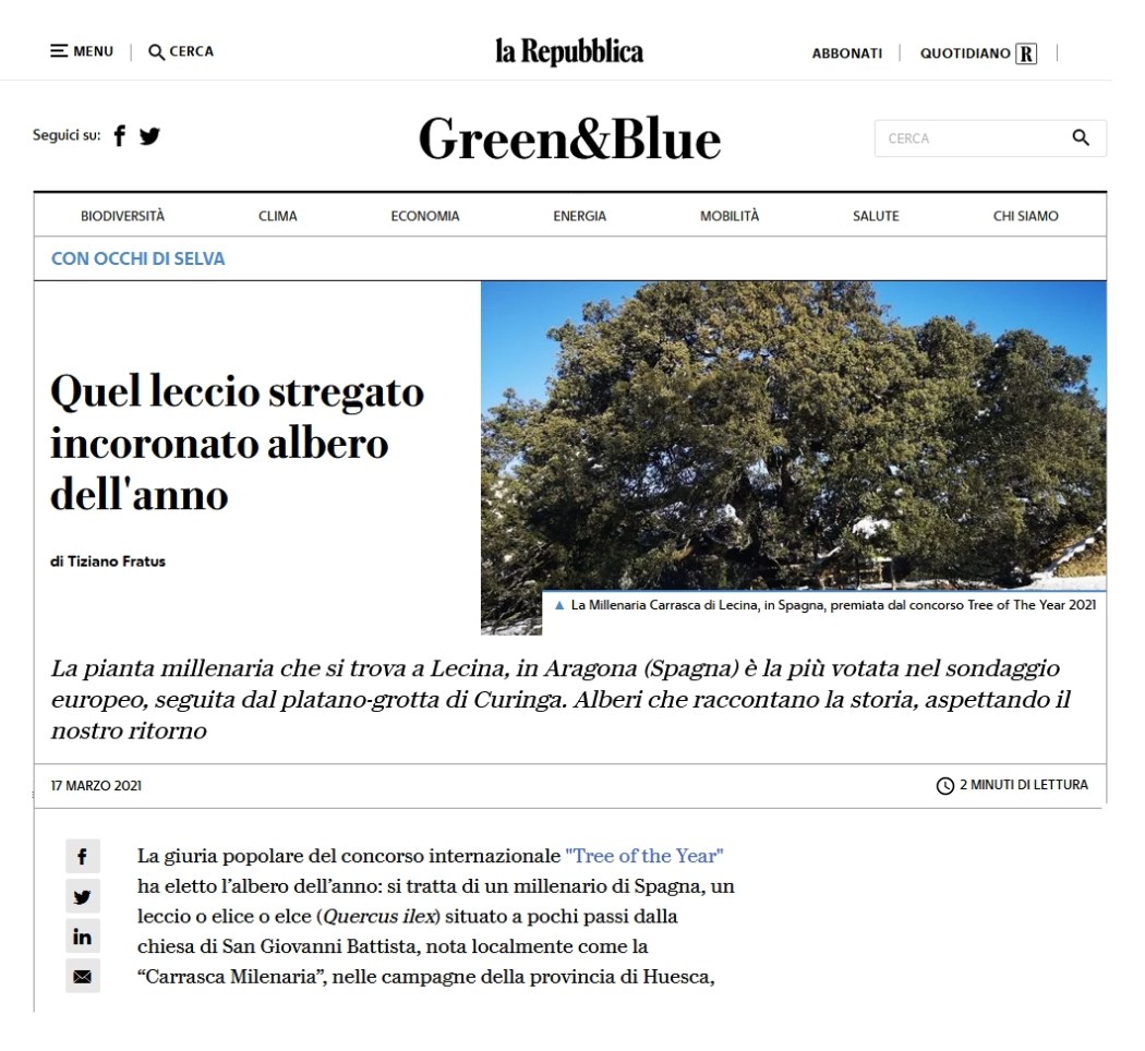 Tree of the Year, Albero dell’anno, è finita cosi: Carrasca milenaria (Spagna) voti 104mila, Platano di Curinga (Italia) voti 78mila, Sicomoro (Russia) voti 66mila. Qui trovate un articolo in cui parlo di questo elice o elce o leccio millenario nelle campagne della comunità autonoma di Aragona, detto anche delle streghe (las brujas) perchè nel medioevo accadevano cose che voi… buona lettura