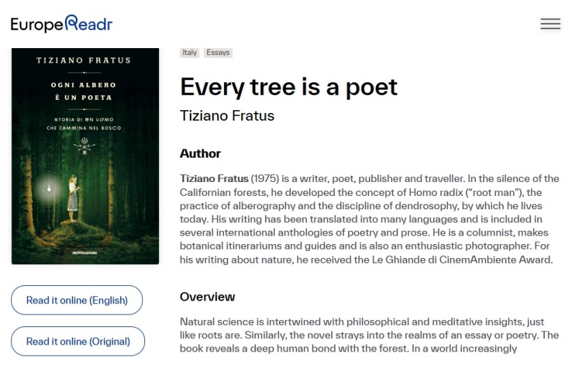 Assai grato al progetto Europe Readr che ha selezionato, a rappresentanza di ogni paese dell’Unione, un romanzo, un saggio o una raccolta di poesie che tocchi e attraversi il tema di The Future of Living, il futuro del vivere, dell’abitare, del convivere, con una chiara dimensione ambientale.