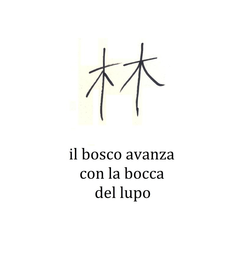 林 è un pittogramma cinese che si legge lin, rappresenta due alberi (mu) insieme, accostati; hayashi in giapponese. Quest’altro pittogramma, 森, invece si legge shin, in cinese, e mori, in giapponese. Qui sono tre alberi insieme, un bosco più vasto e contorto. Che cosa ci avvicina ai boschi e alle foreste? Che cosa forse speriamo anche di incontrare, a parte il silenzio, il vociare diffuso di tutte quelle realtà che abitano lontano da noi? Il selvatico. E magari addirittura il più sfuggente degli animali selvatici, il lupo.