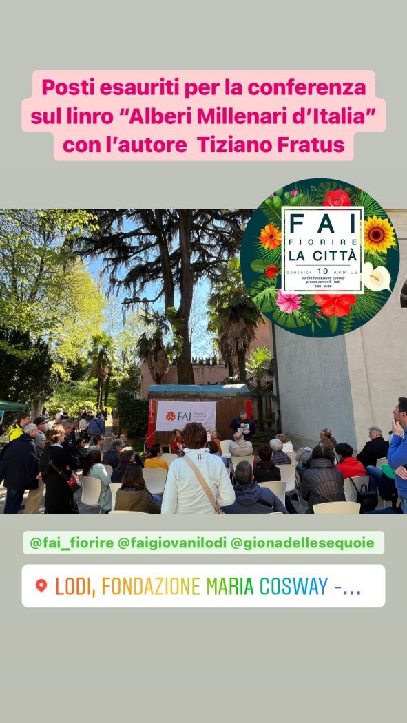 Grazie alla delegazione del FAI di Lodi che come suo solito mi ha accolto con gentilezza e cura. E grazie a tutti coloro che sono venuti ad ascoltare la nostra presentazione, alla Libreria Sommaruga che ci ha supportati e ai tanti acquirenti di una copia di Alberi millenari d’Italia. Un caro saluto a tutti voi.