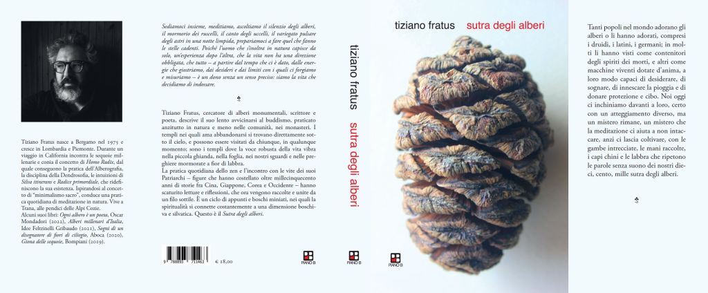 Questa estate se ne sta andando tranquilla. Certo fa un gran caldo, certo c’è la crisi di governo, certo abbiamo dimenticato in fretta quel che accade oltre confine e siamo di nuovo qui a parlare di covid e di misure da prendere. Ora, chi nella vita di ogni giorno cerca di coniugare parole e “professionalità” (?), mestiere (?), redditività (qui ?x3, almeno…), ovviamente prosegue a segnalare le proprie opere, le nuove edizioni, gli incontri coi lettori, la partecipazione a festival, i premi, le citazioni, le recensioni insomma la solita tiritera. E così faccio anch’io. Oggi inizierò a presentarvi un silvario (libro) a cui ho lavorato molto e che mi ha messo davvero in crisi, ripetutamente. Ogni frase è stata vagliata, per quanto possibile, così ogni riferimento, e credo di poter sostenere che si tratti di uno di quei libri a cui avrei potuto lavorare per il resto della vita, ma che ho alla fine “congelato” nella forma che esce tra poche settimane nelle librerie. E con me ci hanno lavorato assai gli editori, chi impagina, chi realizza la copertina, i testi in quarta e tutto quel che vedrete. Anche il titolo è frutto di un lungo travaglio, ha preso spazio, rispetto ad altri, anche grazie ad un direttore editoriale che alla fine non lo ha pubblicato, ma che ha dato il suo personale contributo. Il titolo è “Sutra degli alberi” e qui iniziamo col riportare la copertina complessiva, compresa di quarta e alette. L’avevo già anticipato, viene pubblicato da Piano B a Prato, editore che in questi anni ha pubblicato tanti ottimi autori del passato e del presente che indagano il proprio profondo rapporto con quella dimensione generica che chiamano “natura”. Le prime presentazioni a settembre. Qui dentro ci siamo inginocchiati e ci siamo interrogati molto sul senso, sul dono, lo vedremo pagina per pagina, bosco per bosco, albero per albero.