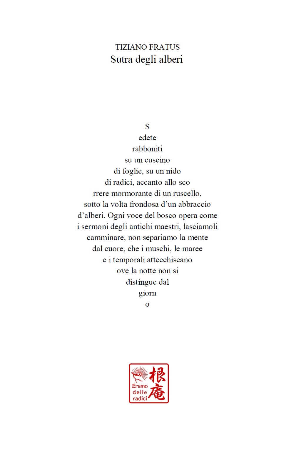 Una delle selve d’inchiostro di Sutra degli alberi è dedicata alla poesia: contiene una ventina di componimenti poetici dedicati e ispirati al meditare e al meditare tra foglie, radici, cortecce e respiri. Una buona lettura