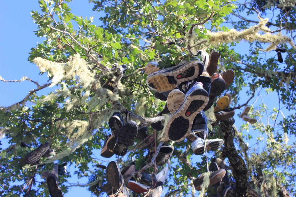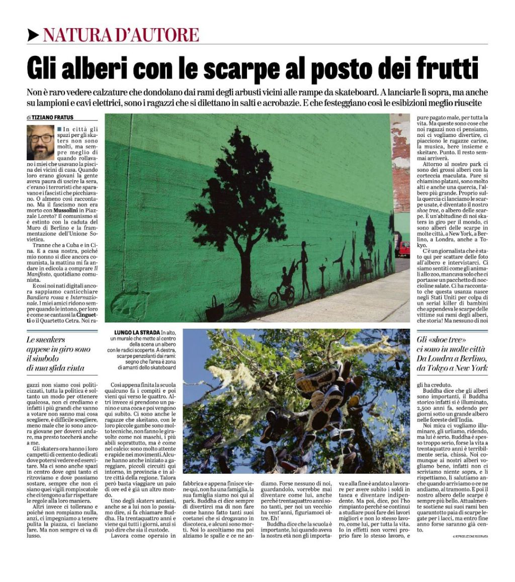 Attorno al nostro park ci sono dei grossi alberi con la corteccia maculata. Pare si chiamino platani, sono molto alti e anche una quercia, l’albero più grande. Proprio sulla quercia ci lanciamo le scarpe usate, è diventato il nostro Shoe Tree, o albero delle scarpe. È un’abitudine di noi skaters in giro per il mondo, ci sono alberi delle scarpe in molte città, a New York, a Berlino, a Londra, anche a Tokyo. C’è un giornalista che è stato qui per scattare delle foto all’albero e intervistarci. Ci siamo sentiti come gli animali allo zoo, mancava solo che ci portasse un pacchetto di noccioline salate. Ci ha raccontato che questa usanza nasce negli Stati Uniti per colpa di un serial killer di bambini che appendeva le scarpe delle vittime sui rami degli alberi, che storia! Ma nessuno di noi gli ha creduto.