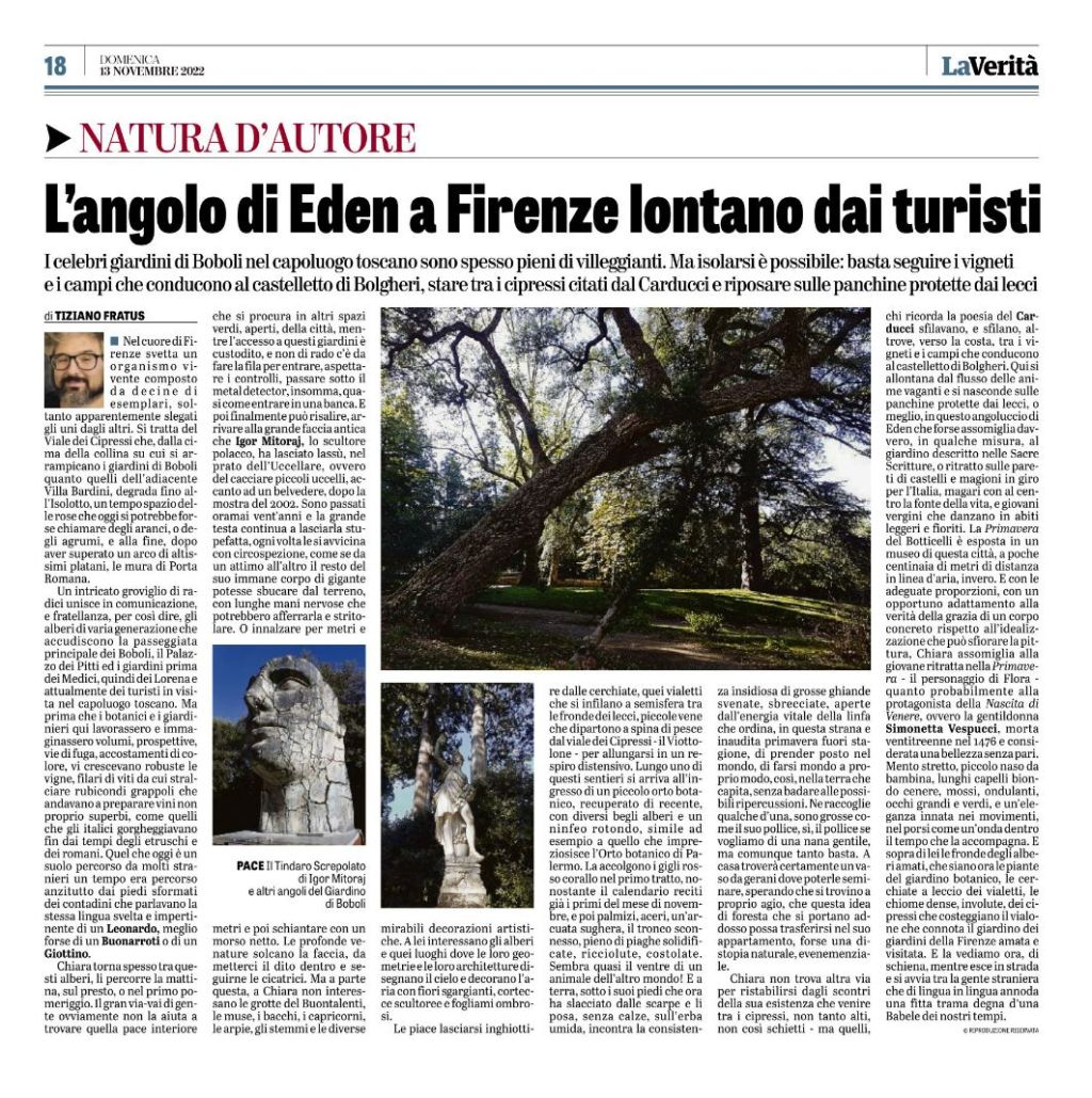 Chiara non trova altra via per ristabilirsi dagli scontri della sua esistenza che venire tra i cipressi, non tanto alti, non così schietti – ma quelli, chi ricorda la poesia del Carducci sfilavano, e sfilano, altrove, verso la costa, tra i vigneti e i campi che conducono al castelletto di Bolgheri. Qui si allontana dal flusso delle anime vaganti e si nasconde sulle panchine protette dai lecci, o meglio, in questo angoluccio di Eden che forse assomiglia davvero, in qualche misura, al giardino descritto nelle Sacre Scritture, o ritratto sulle pareti di castelli e magioni in giro per l’Italia, magari con al centro la fonte della vita, e giovani vergini che danzano in abiti leggeri e fioriti. La Primavera del Botticelli è esposta in un museo di questa città, a poche centinaia di metri di distanza in linea d’aria, invero. E con le adeguate proporzioni, con un opportuno adattamento alla verità della grazia di un corpo concreto rispetto all’idealizzazione che può sfiorare la pittura, Chiara assomiglia alla giovane ritratta nella Primavera – il personaggio di Flora – quanto probabilmente alla protagonista della Nascita di Venere, ovvero la gentildonna Simonetta Vespucci, morta ventitreenne nel 1476 e considerata una bellezza senza pari. Mento stretto, piccolo naso da bambina, lunghi capelli biondo cenere, mossi, ondulanti, occhi grandi e verdi, e un’eleganza innata nei movimenti, nel porsi come un’onda dentro il tempo che la accompagna. E sopra di lei le fronde degli alberi amati, che siano ora le piante del giardino botanico, le cerchiate a leccio dei vialetti, le chiome dense, involute, dei cipressi che costeggiano il vialone che connota il giardino dei giardini della Firenze amata e visitata. E la vediamo ora, di schiena, mentre esce in strada e si avvia tra la gente straniera che di lingua in lingua annoda una fitta trama degna d’una Babele dei nostri tempi.