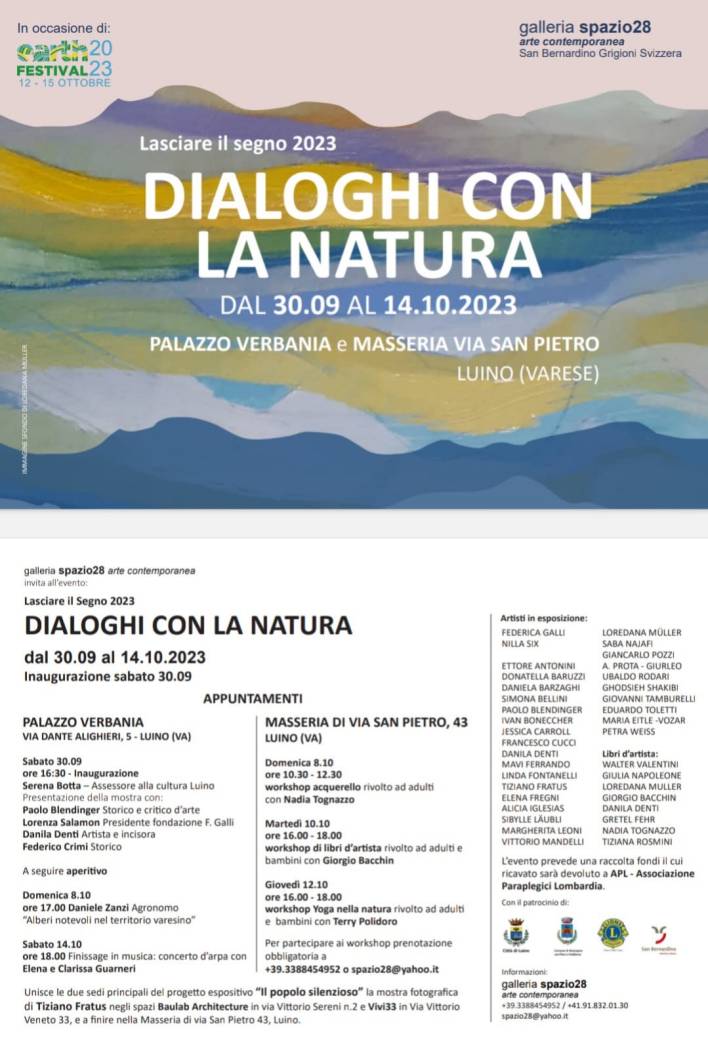 Inaugura una collettiva di artisti a Luino, nell’ambito della manifestazione Dialoghi con la natura, in collaborazione con l’Earth Festival 2023; tra le mostre ospiti Il popolo silenzioso di Tiziano Fratus, esposta in tre locations: Baulab Architecture (via Vittorio Sereni 2), Vivi33 (via Vittorio Veneto 33) e Masseria (via San Pietro 43).