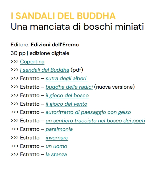 La meditazione buddista è entrata a far parte della mia quotidianità. E’ una pratica che innerva e coinvolge diversi aspetti della mia modestissima esistenza. Di tanto in tanto può carambolare nei processi creativi della scrittura, riversandosi sulla pagina e modellando i versi di qualche bosco inchiostrato, piccoli sentieri, parole talora incise con la linfa delle piante, tracciate nell’acqua o disegnate sulla neve. Ho riordinato alcune poesie che ho intitolato I sandali del Buddha, tutte ampiamente ispirate e disciplinate dal buddismo agreste che tento, ogni giorno, a mio modo, nei mie tanti limiti, di praticare.