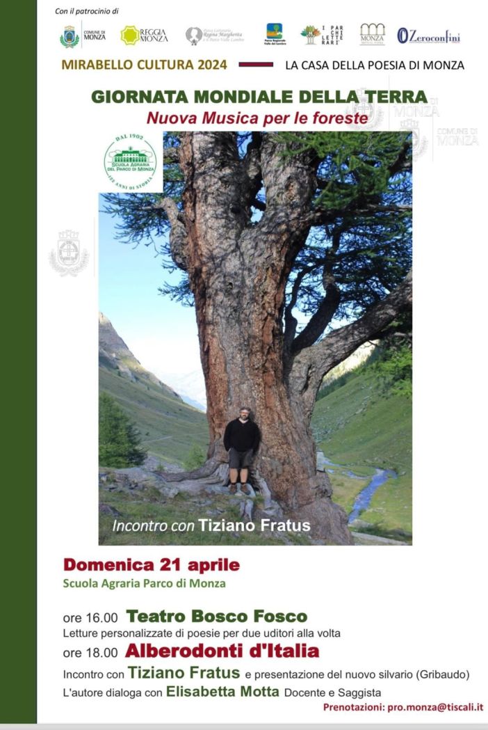 Il 21 aprile, giornatina mondialina della terrina, avrò le plaisire di tornare al Parco di Monza grazie alle amiche della Casa della Poesia, che ringrazio ulteriormente e nuovamente. Alle 16 debutta una nuova stagione di letture poetiche personalizzata, piccolo teatro anatomico, oratorio per due spettatori alla volta, Teatro Bosco Fosco, ne avevo fatti diversi prima del COVID e al tempo sotto il titolo di Domus respirandi. In sostanza scegliete uno o due temi e leggovi poesie per 15 minuti circa, un minuto di silenzio, saluti e nuovi uditori. Quante cose funzionano o non funzionano in 15 minuti? Assai… Alle 18 seguirà la presentazione del nuovo silvario Alberodonti d’Italia. Prenotazioni: pro.monza@tiscali.it
