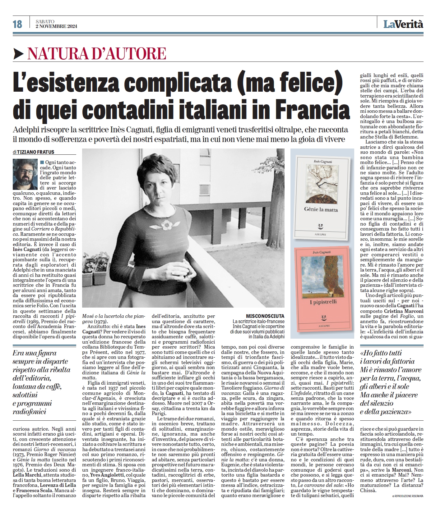 Il caso editoriale che riguarda la riscoperta di Ines Cagnati è particolarmente interessante. Le sue origini italiane e contadine, le discriminazioni, una infanzia non facile ma nemmeno solo traumatica, i suoi romanzi e i suoi racconti. La scrittura, anzitutto, feroce quando serve, tenera quando serve. Una buona lettura.