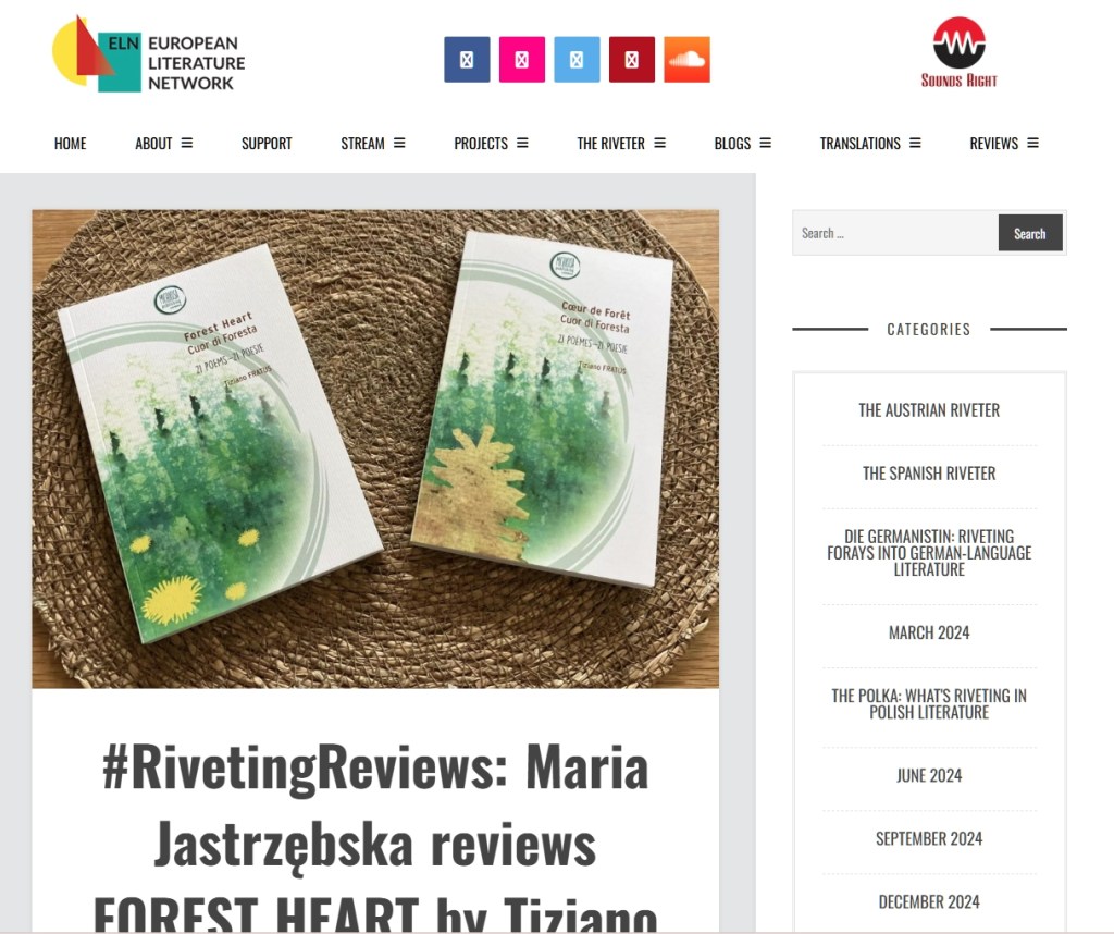 Ogni tanto accade che all’estero avvistino le traduzioni delle mie poesie o dei miei boschi miniati e ne scrivano. In questo caso si tratta di una minuta tiratura di una selezione pubblicata in Lussemburgo per i tipi di Michikusa, una in inglese (Forest Heart) e l’altra in francese (Coeur de foret). Ringrazio la direzione di Riveting Reviews / European Literature Network e la poetessa Maria Jastrzebska per le osservioni e le parole di attenzione al mio percorso ombroso, sotterraneo e boscoso. Ringrazio nuovamente l’editore e i traduttori.
