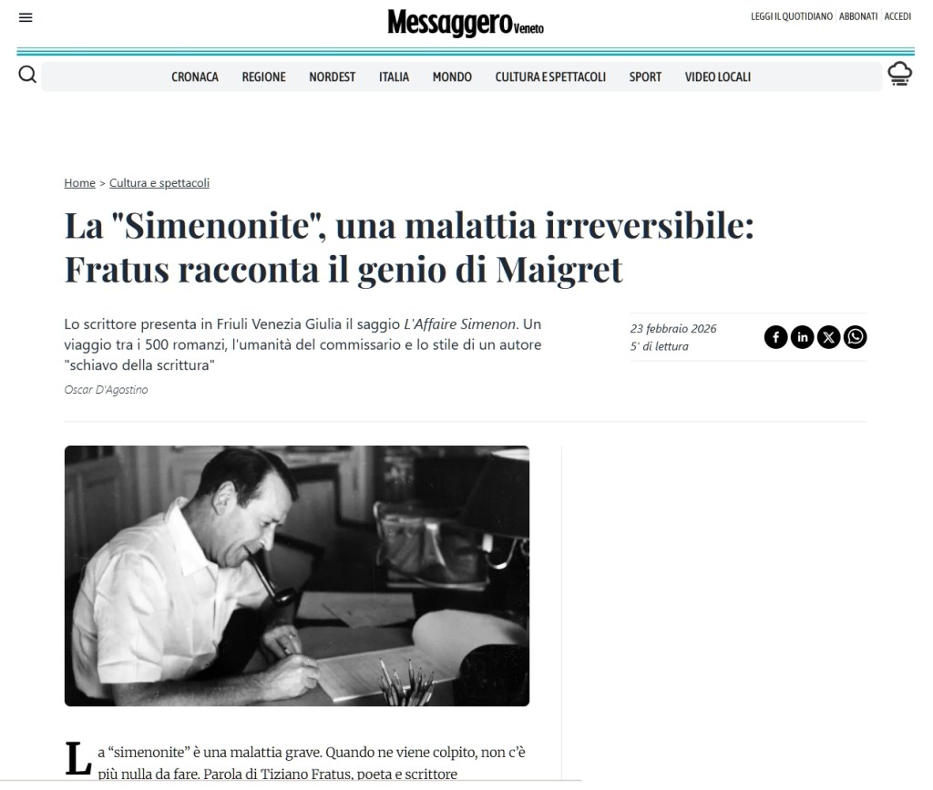 Oggi ricca intervista al Messaggero Veneto dedicata a Simenon e a L’Affaire Simenon che nei prossimi giorni presenteremo in varie città del nord-est (Lignano Sabbiadoro, Trieste, Venezia, Villorba e infine Udine). Ringrazio Oscar D’Agostino per la sua curiosità. Una buona lettura 🙏