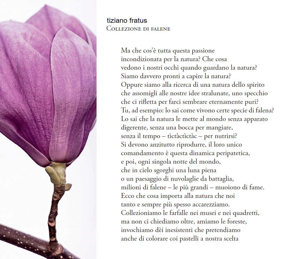 «Le poesie di Tiziano Fratus disegnano e raccontano le connessioni profonde che ci legano alla natura. Con pacato affetto lo sguardo dell’uomo prova meraviglia e sperimenta il calore materno dell’appartenenza all’universo. Tiziano ci regala, così, liriche scultoree, destinate a stare nel tempo, a vivere come alberi nel bosco»
